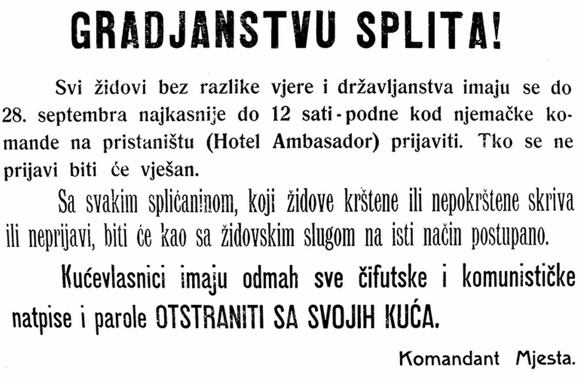Nijemci su ušli u Split 27. rujna 1943. praćeni ustašama. Neki su se Židovi posakrivali ali teško je bilo živjeti i sakrivati se neprimijećen, pogotovo zbog neprestanih racija. Istoga dana kada su Nijemci uzeli vlast u gradu, istakli su oglase u kojima Vojna komanda poziva sve Židove da se odmah prijave u zgradi bivšeg hotela »Ambasador« gdje su smjestili komandu. Tko se ne prijavi bit će obješen. Ista kazna čeka, istaknuto je, one građane koji ih budu sakrivali ili im u tome pomagali. Natpisi i parole što su ostali nakon povlačenja NOV-e iz Splita, koje je trebalo ukloniti, nazvani su u tim proglasima »ćifutskim i komunističkim«. Sve židovske radnje u gradu zatvorene su a posljednja među njima, 6. listopada, Morpurgova knjižara na Pjaci, tadašnjem trgu Ante Pavelića. Na zatvorene dućane postavljena je obavijest »Zatvoreno po nalogu Ministra za oslobođene krajeve« (E. Bulata), a na ispražnjene stanove »Juden wohnung – Beschlagname« (Židovski stan – zapljena) i pečat njemačkog »Standort Komandanta« u Splitu. Njemački okupatori i njihovi ustaški suradnici započeli su i u mjesnoj štampi protužidovsku propagandu da bi opravdali svoje akcije i pokušali u narodu stvoriti raspoloženje protiv njih. Nekoliko dana prije oslobođenja, uoči bijega, pustili su Nijemci posljednje u Splitu zatočene Židove kućama, vrativši im ključeve njihovih praznih i opljačkanih stanova.